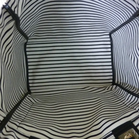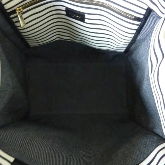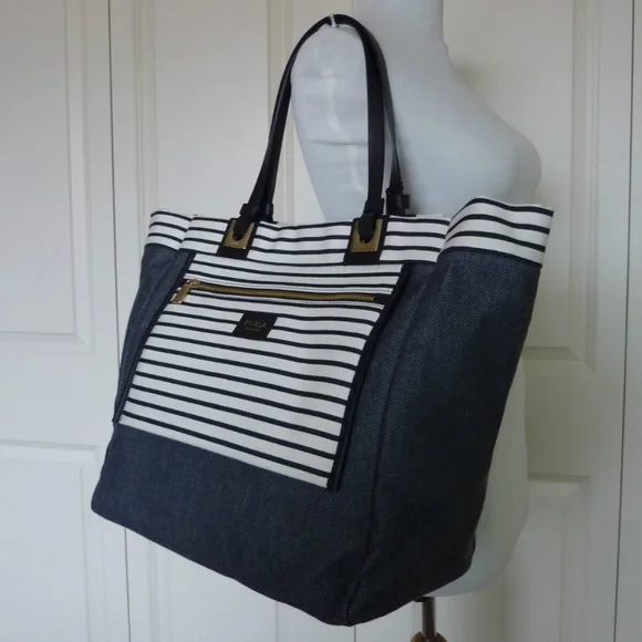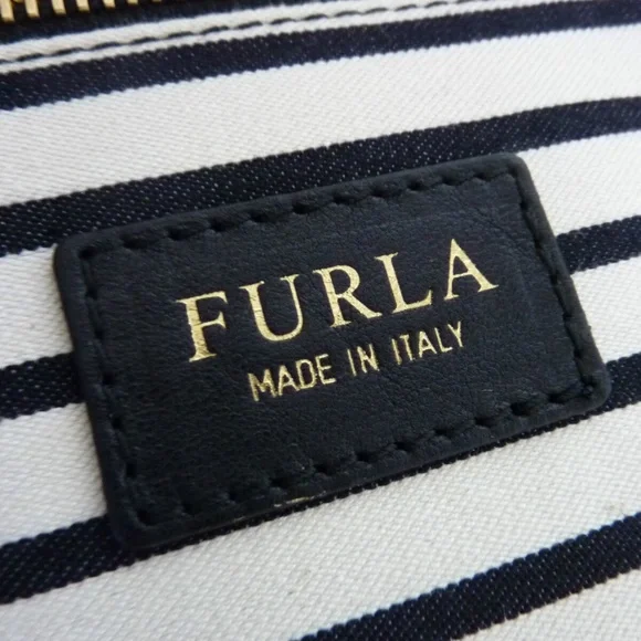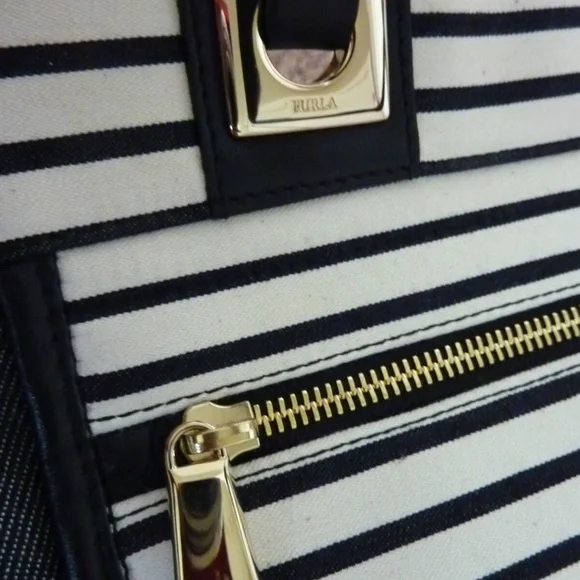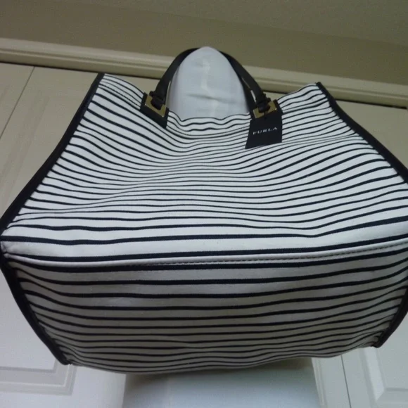 Furla and I or also called Tribe Tote by Furla™.This beautiful tote bag is made of black/black denim/muslin color canvas with leather strapHolds your wallet, lipstick, sunglasses, and personal technology.Dimensions: 13" wide across bottom x 13" tall center x 5" deep. When it's square.Top width is 17" when you turn it into and flare top toteDouble handle 8" drop.Hidden magnetic button closure1 zipper pocketPale gold tone metalware.Comes complete with it's dustbag and bookletThe shape looks a crooked in the pictures because it's brand new and the fabric is still stiff.