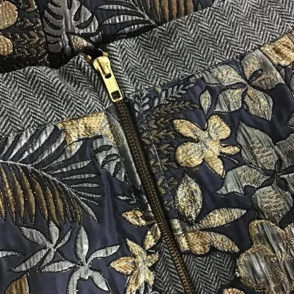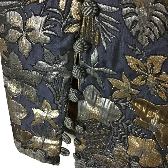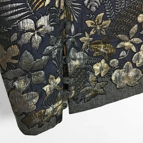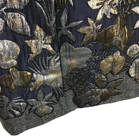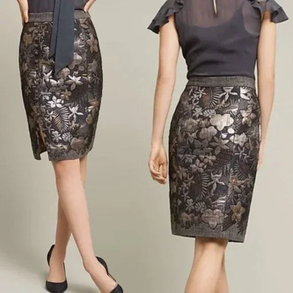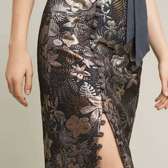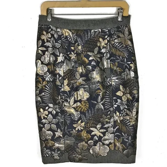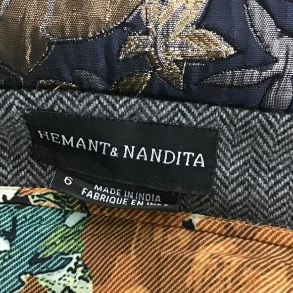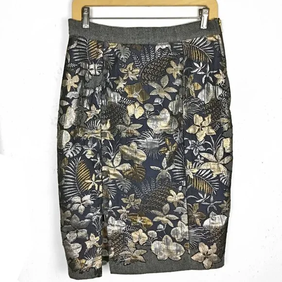 HEMANT & NANDITA Metallic Floral Brocade Skirt, in excellent preloved condition.Size: 6Crafted in India by skilled embroiderers, this shimmering piece features an autumnally hued floral motif and an evening-ready silhouette. From Hemant & Nandita. ~ Polyester, wool, acrylic, nylon; polyester lining~ Pencil silhouette~ Embroidered detail~ Side zipDry clean