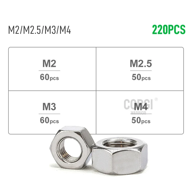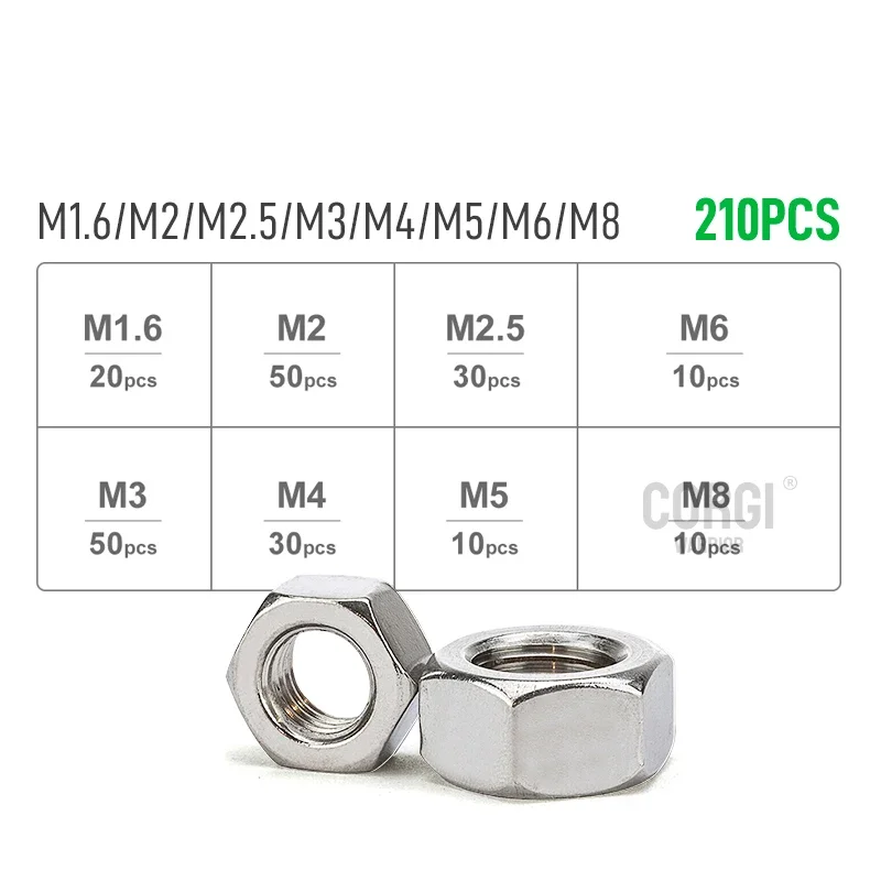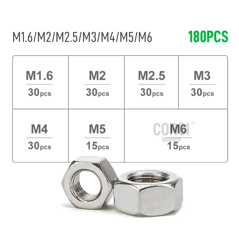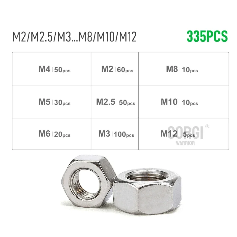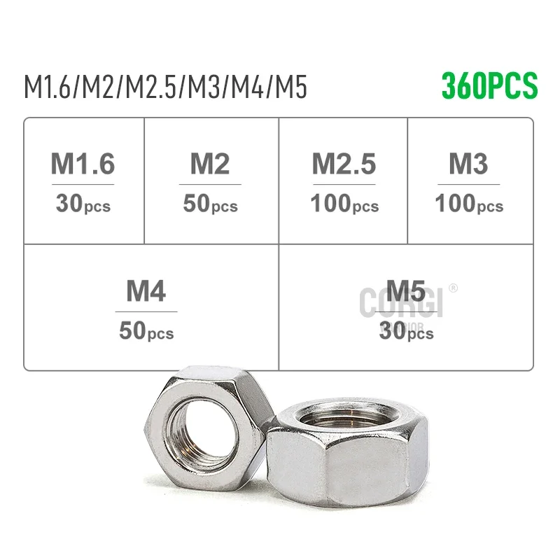 Metric Hex Nuts Assortment Kit 180-360 304 Stainless Steel M1.6 M2 M2.5 M3 M4 M5 M6 M8 M10 M12 Wholesale Assorted Hex Nuts Set