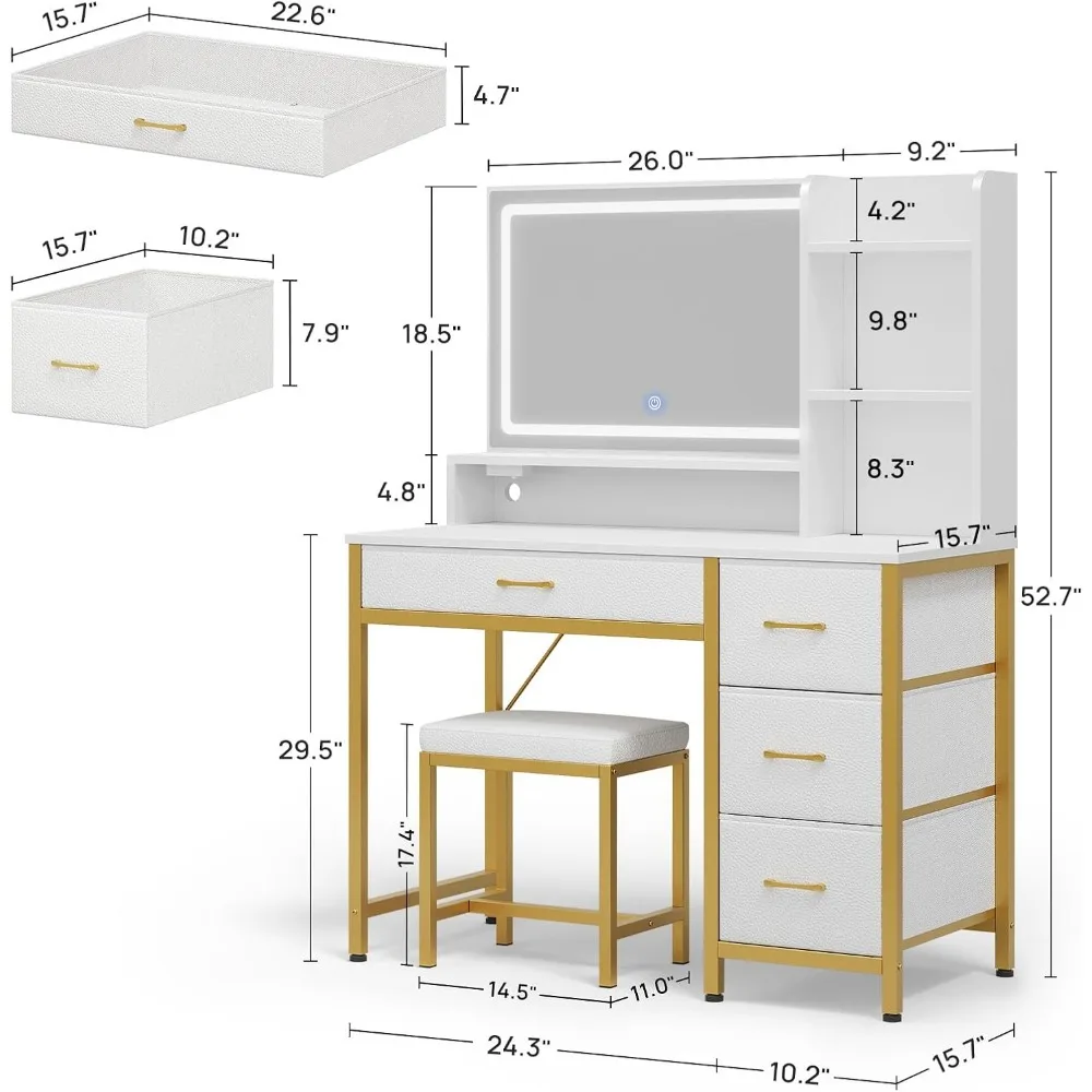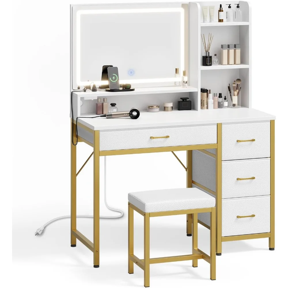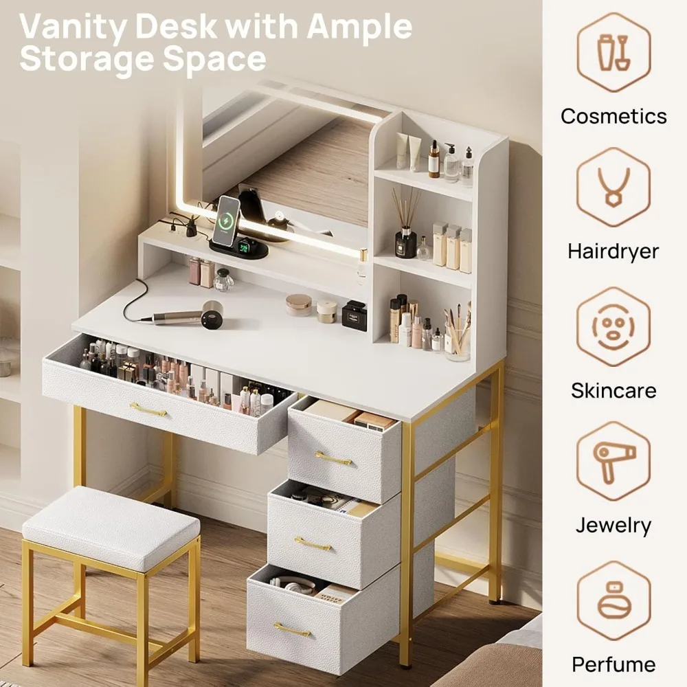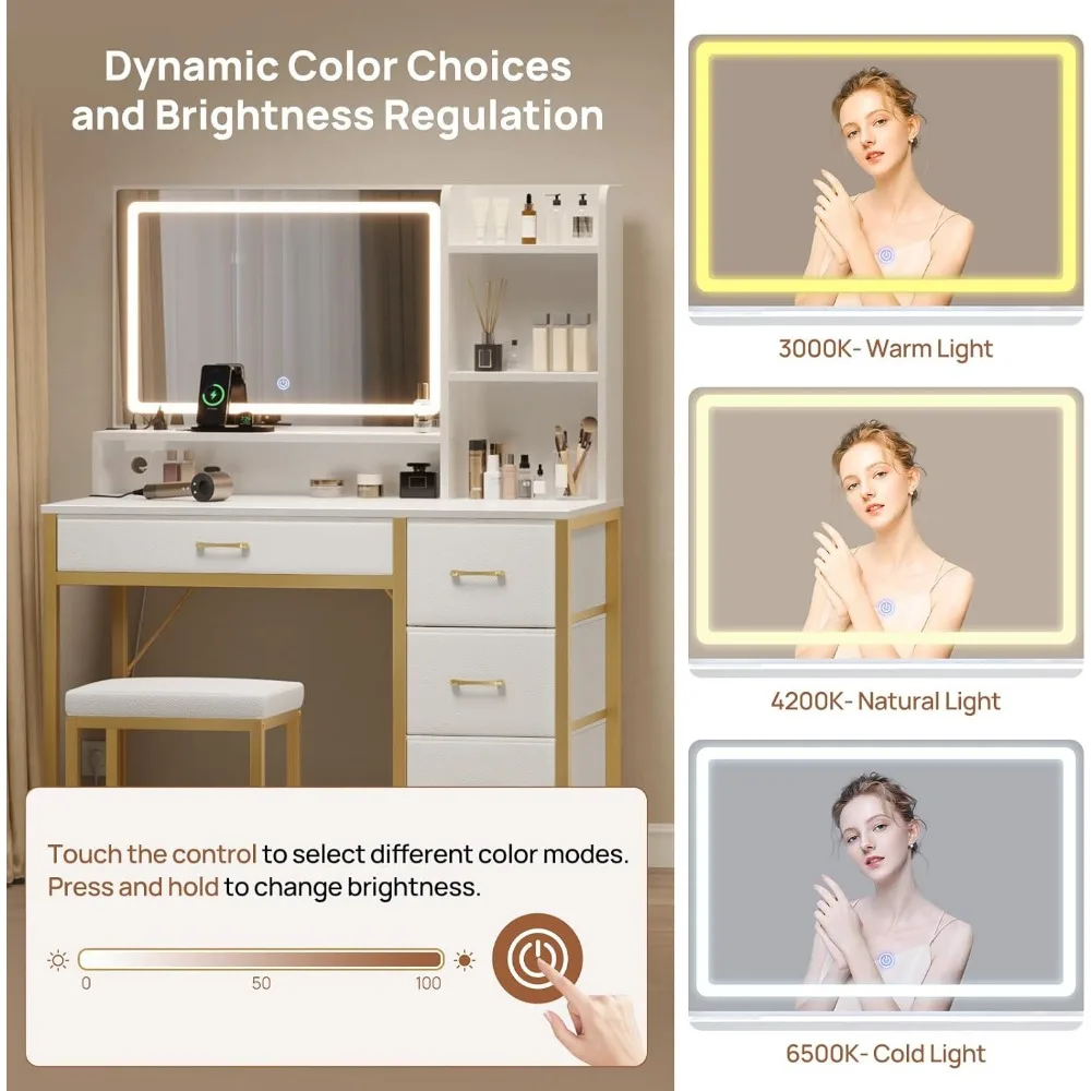 3 Lighting Modes & Adjustable Brightness: The vanity mirror offers 3 light colors, cold light, natural light, and warm light. Adjust the lighting mode by touching the button on the mirror, or press the button to change the brightness. The precise lighting enhances the natural look of your makeup, perfect for any occasion Upholstered Vanity Stool : This vanity set includes a stylish stool crafted with PU leather and plush foam padding. Designed to complement the vanity's sleek look, it enhances your comfort while applying makeup Ample Storage: The vanity desk features 4 fabric drawers and 4 open compartments, providing plenty of space to store makeup, hair tools, and other beauty essentials, keeping everything neatly organized and easily accessible Convenient Charging Station: Equipped with a power strip featuring 2 AC outlets and 2 USB ports, the makeup vanity allows you to easily connect hair tools, chargers, and other electronics. The built-in design keeps all the cords well hidden throughout the shelves for a tidy look Modern Design: The sleek design, combined with the modern white finish, adds an elegant touch to the lighted vanity desk, making it easily integrate into any decor style and refreshing your space. It's the perfect gift for family or friends on holidays or special occasions