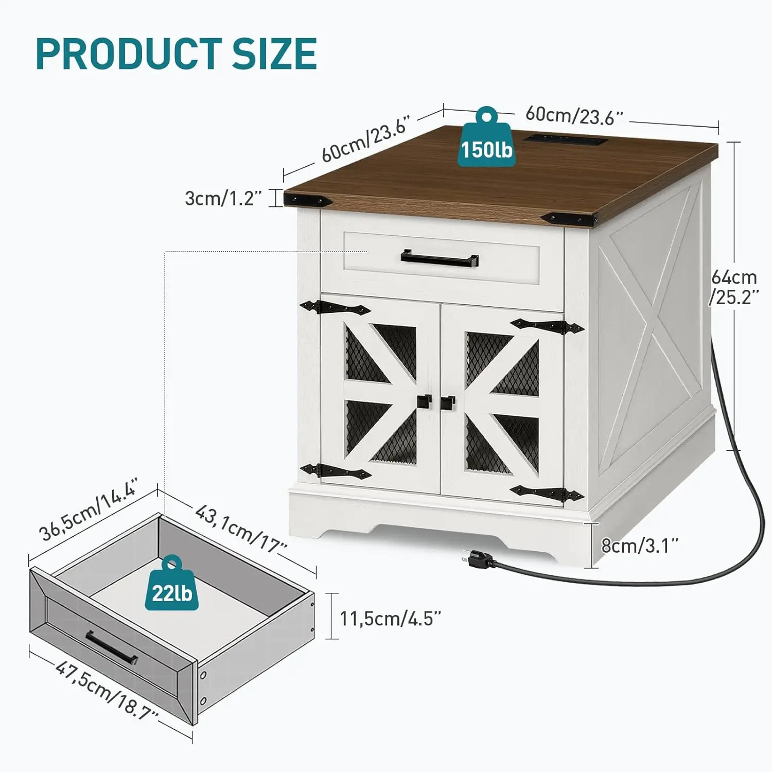 Charging Station: This 23.6"L x 23.6"W large farmhouse sofa side table with charging station comes with 2 standard outlets and 2 USB ports, allowing for convenient charging of laptops, phones, lamps, and other devices simultaneously. It promotes efficiency by reducing cord clutter with a back cable hole